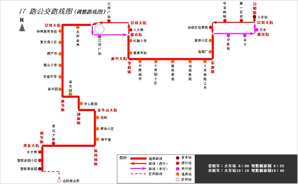 火車站—遼河大街—東新路—新興大街—學(xué)府路—遼河大街—市委廣場(chǎng)—遼河大街—新華路—富安園北側(cè)道路—?jiǎng)?chuàng)新路—金牛山大街—體育館路—青花大街—清華路—智勝新家園(終點(diǎn)回返)—清華路—青花大街—體育館路—金牛山大街—?jiǎng)?chuàng)新路—富安園北側(cè)道路—新華路—遼河大街—市委廣場(chǎng)—建設(shè)街—學(xué)府路—新興大街—東新路—建設(shè)街—公園路—火車站。