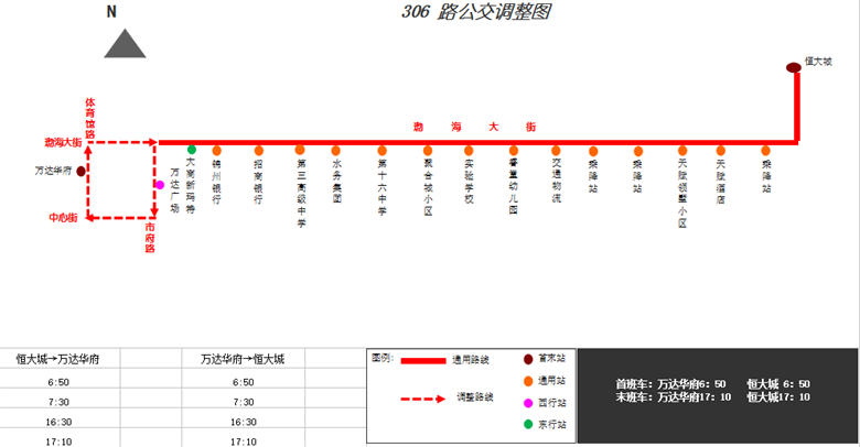 調(diào)整后:“恒大城”—渤海大街—原線—“錦州銀行”—市府路—“萬達廣場”(西行單向站)—中心街—“萬達華府”。
