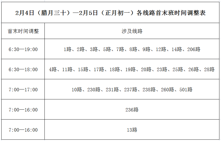 (一)2月4日、5日(三十、初一)首班延后發(fā)車(chē)、末班提前收車(chē),具體明細(xì)見(jiàn)下表:
